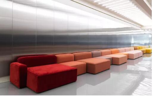 入口處的通道“Hall”,使用冰冷的鋼鐵的材質(zhì), Normann 色彩鮮艷的“The Rope”沙發(fā)組合在通道內(nèi)一字排開。Stage 區(qū)域里, 160 盞 Amp 燈下展示著 The Ace collection, Daily Fiction collection,這也是品牌新品的展示區(qū)